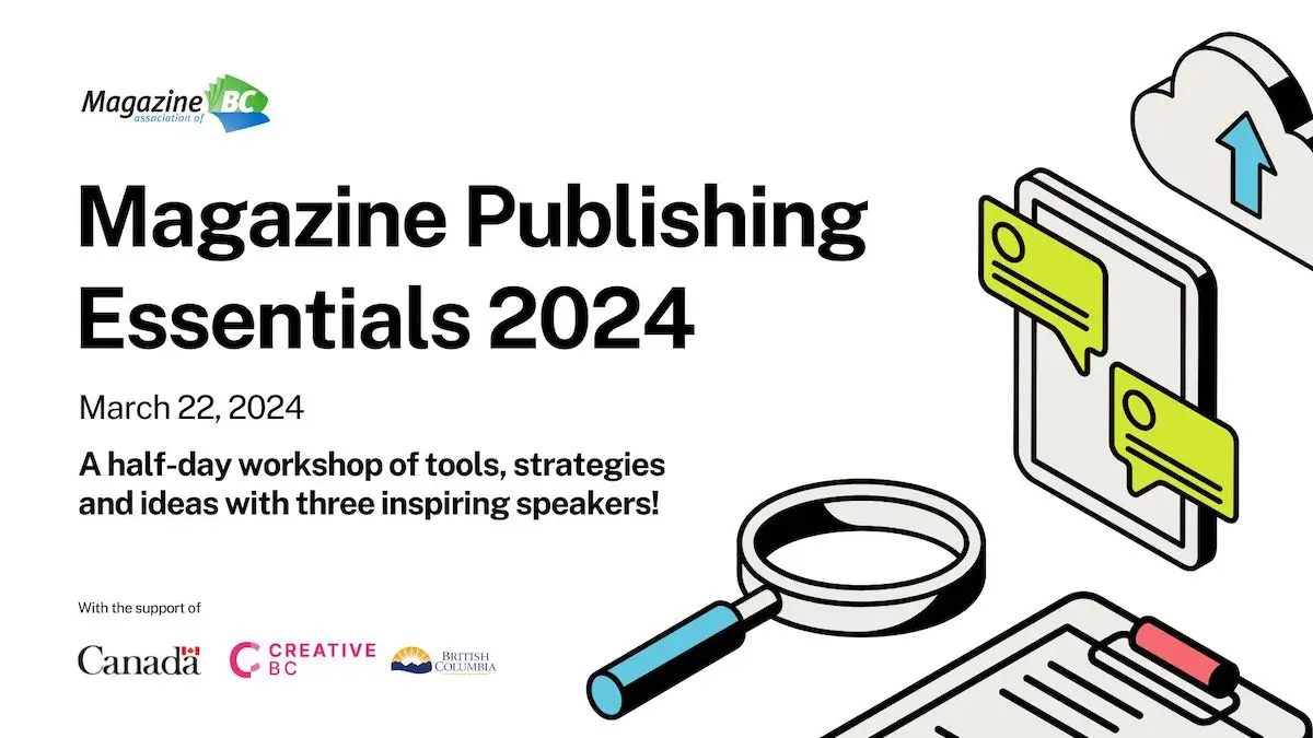 MagsBC Magazine Publishing Essentials 2024. March 22, 2024. A half-day workshop of tools, strategies and ideas with three inspiring speakers! With the support of the government of Canada, Creative BC and the province of British Columbia.
