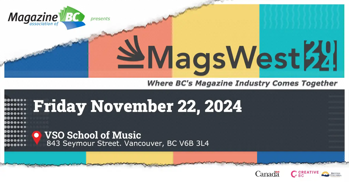 MagsWest will be held on Friday, November 22, 2024 in person in Vancouver! All sessions will be presented at the VSO School of Music, 843 Seymour Street, Vancouver, BC.